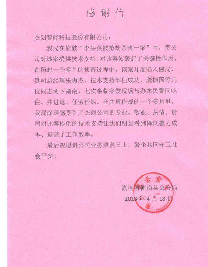 近日,湖南省衡南公安局发来感谢函,对星空电竞xingkong智能在近期协助侦破“李某英被抢劫杀害一案”表示感谢,目前相关犯罪嫌疑人已被依法刑事拘留,案件正在进一步侦办中。